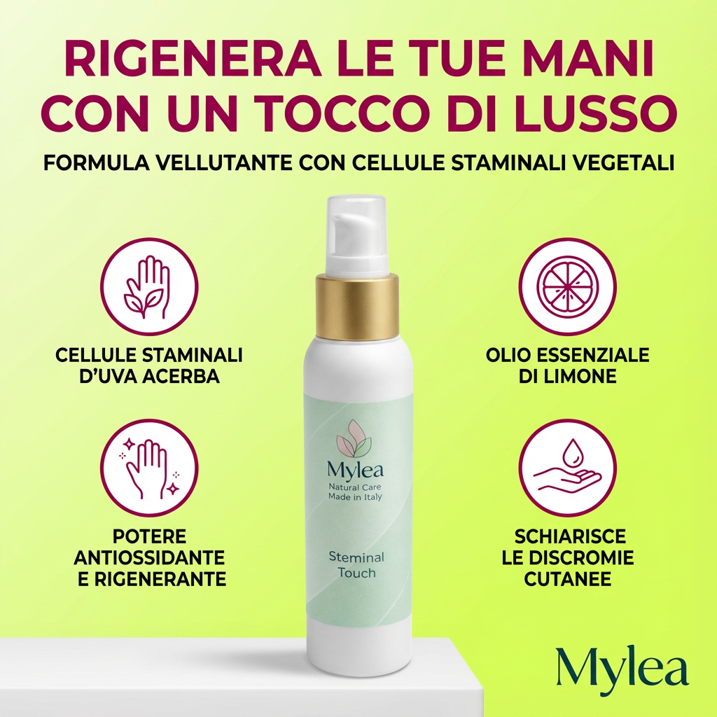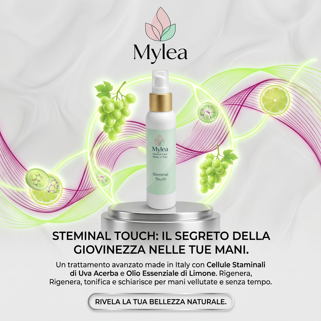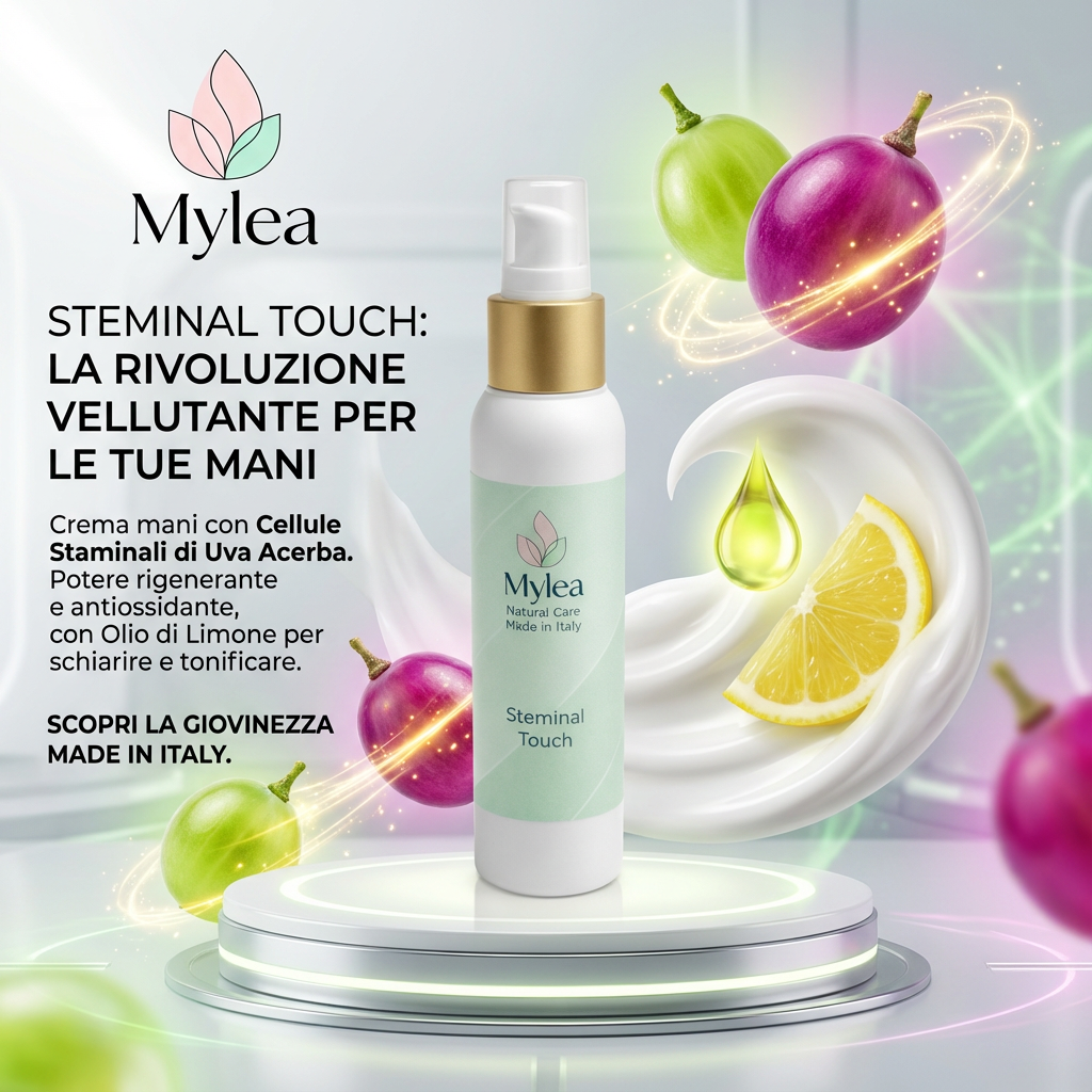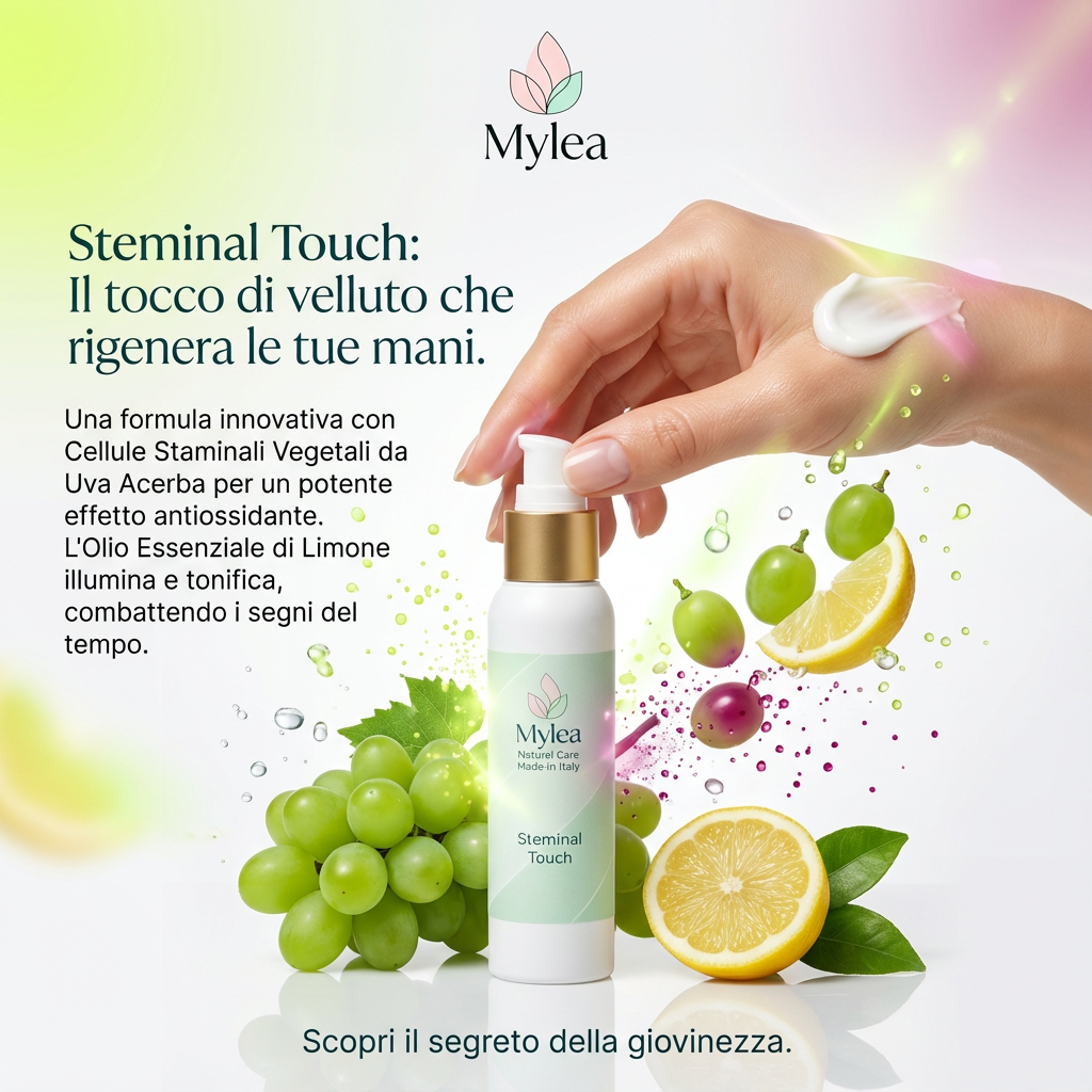 Crema mani made in Italy vellutante con Cellule Staminali Vegetali estratte da Uva Acerba. Queste cellule, derivate dai piccoli acini di uva in accrescimento, sono ricche di Polifenoli ed hanno un forte potere antiossidante e rigenerante. L'Olio Essenziale di Limone, ottenuto dalla spremitura a freddo delle sue bucce, favorisce la tonicità della pelle, combatte i segni del tempo e schiarisce le discromie cutanee. La crema stimola il rinnovamento cellulare e nutre in profondità, contrastando rossori ed aridità. E' il complemento ideale dopo ogni manicure e Il suo uso costante dona alle mani un aspetto vellutato e più giovane.